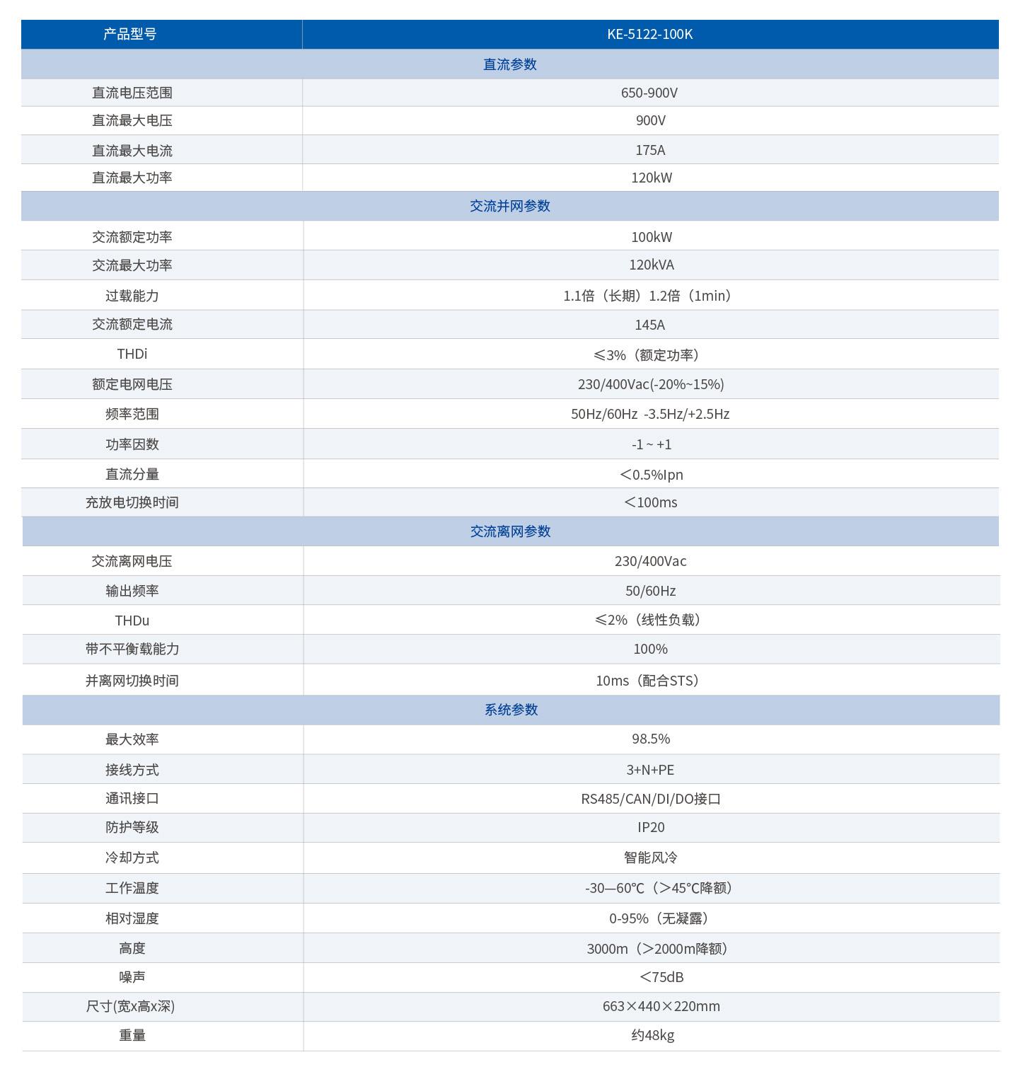 支持多机并联,直流电压范围650-900V,交流额定功率100kW(最大120kVA),充放电切换<100ms,过载能力最大1.2倍(1min)。